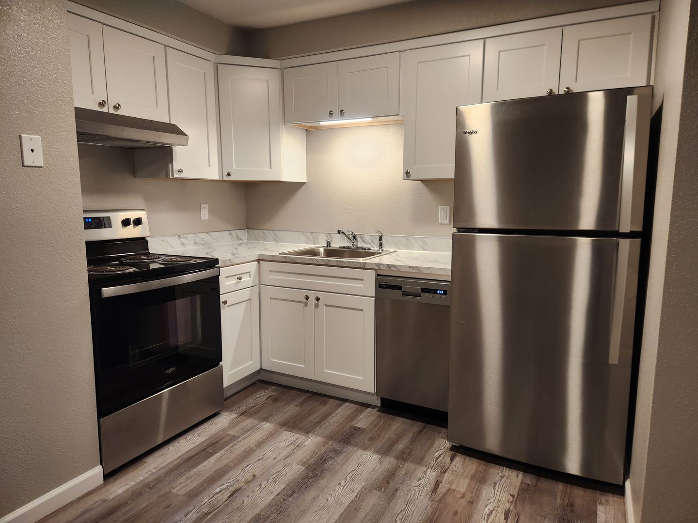This beautiful, newly renovated apartment home features sleek hardwood-style floors, brand new cabinets, new appliances, and bright, modern finishes. Water, sewer, garbage and yard care are included in rent. Small pets allowed! (35lbs or less)